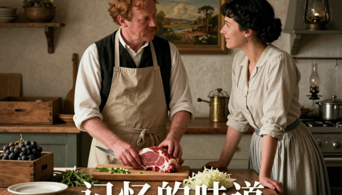 模型:z-image 提示词 一张虚构的英语电影《回忆之味》的电影海报。场景设置在一个质朴的19世纪风格厨房里。画面中央,一位红棕色头发、留着小胡子的中年男子(演员阿瑟·彭哈利根饰)站在一张木桌后,他身穿白色衬衫、黑色马甲和米色围裙,正看着一位女士,手中拿着一大块生红肉,下方是一个木制切菜板。在他的…