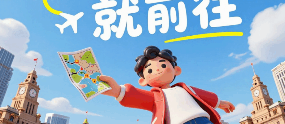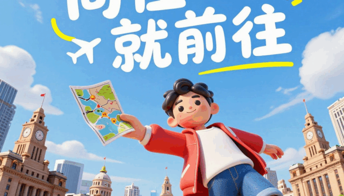 模型:z-image 提示词 一幅有趣的3D插图,整体采用卡通+3D拟物风格,色彩饱和度高,突出视觉吸引力;主题文案白色字体“向往就前往”,采用潮流派对风格艺术字体,模拟真手写笔触,字体笔画粗厚醒目,形态夸张变形,部分笔画带俏皮弧度或独特弯折,营造活波、肆意、充满活力的派对氛围。加入黄色线条和飞机图…