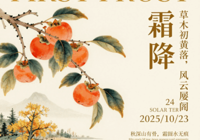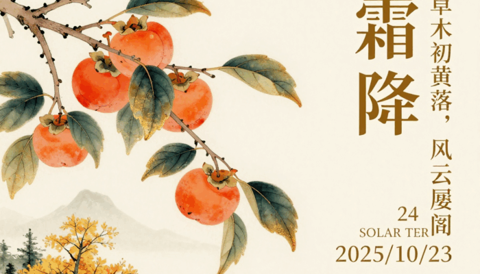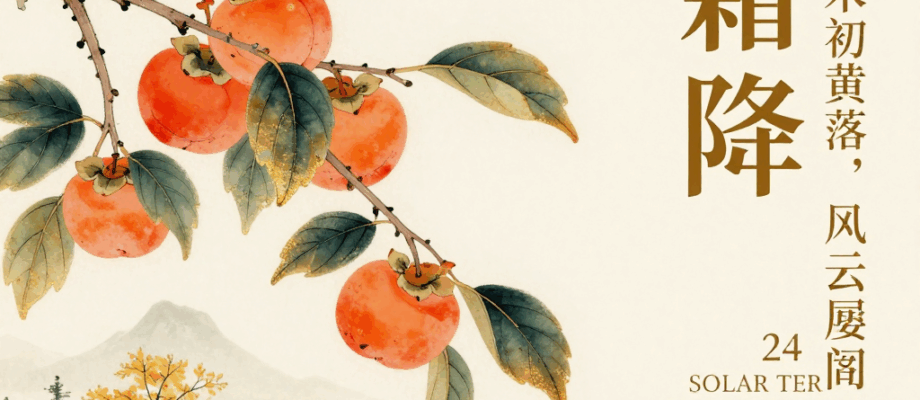 模型:z-image 提示词 新中式国风插画风格,雅致的米白色背景,融合工笔绘画技法与现代排版设计,营造出霜降节气的古朴与诗意氛围。画面左侧是工笔风格的柿子枝,橙红的柿子饱满圆润,搭配深浅不一的绿色叶片,尽显秋日丰收质感;下方嵌入一幅传统山水插画,展现草木初黄的霜降景致。顶部金色艺术字体“FIRST…
