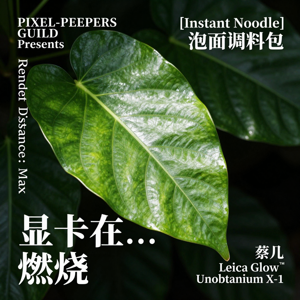 一张方形构图的特写照片,主体是一片巨大的、鲜绿色的植物叶片,并叠加了文字,使其具有海报或杂志封面的外观。主要拍摄对象是一片厚实、有蜡质感的叶子,从左下角到右上角呈对角线弯曲穿过画面。其表面反光性很强,捕捉到一个明亮的直射光源,形成了一道突出的高光,亮面下显露出平行的精细叶脉。背景由其他深绿色的叶子组成,这些叶子轻微失焦,营造出浅景深效果,突出了前景的主叶片。整体风格是写实摄影,明亮的叶片与黑暗的阴影背景之间形成高对比度。图像上有多处渲染文字。左上角是白色的衬线字体文字"PIXEL-PEEPERS GUILD Presents"。右上角同样是白色衬线字体的文字"[Instant Noodle] 泡面调料包"。左侧垂直排列着标题"Render Distance: Max",为白色衬线字体。左下角是五个硕大的白色宋体汉字"显卡在...燃烧"。右下角是较小的白色衬线字体文字"Leica Glow™ Unobtanium X-1",其正上方是用白色宋体字书写的名字"蔡几"。识别出的核心实体包括品牌像素偷窥者协会、其产品线泡面调料包、相机型号买不到™ X-1以及摄影师名字造相。