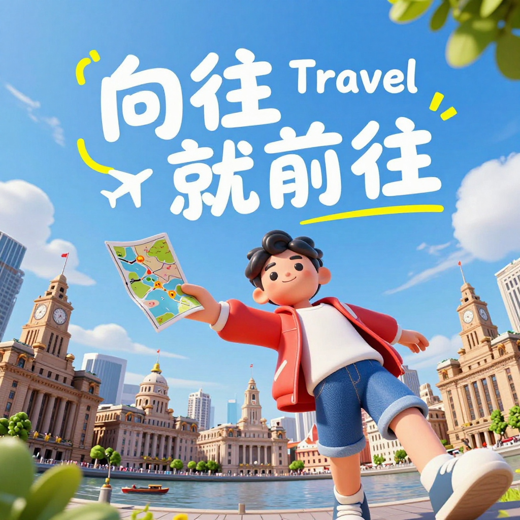 一幅有趣的3D插图,整体采用卡通+3D拟物风格,色彩饱和度高,突出视觉吸引力;主题文案白色字体“向往就前往”,采用潮流派对风格艺术字体,模拟真手写笔触,字体笔画粗厚醒目,形态夸张变形,部分笔画带俏皮弧度或独特弯折,营造活波、肆意、充满活力的派对氛围。加入黄色线条和飞机图标装饰。搭配英文字体“Happy Travel”进行排版;一个男孩,俯视鱼眼镜头,身穿白色背心,红色夹克,蓝色牛仔短裤,一只手伸向前拿着旅游地图递出去的动作,从下往上拍摄,比例很夸张,强烈的仰视透视感,广角,背景为场景上海微缩景观模型地标景点(外滩三件套建筑、外滩、黄浦江、和平饭店,现代城市风貌),蓝天白云动态模糊的树叶装饰。
