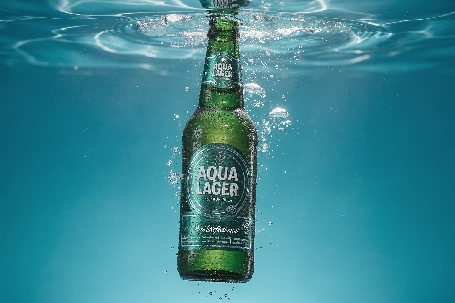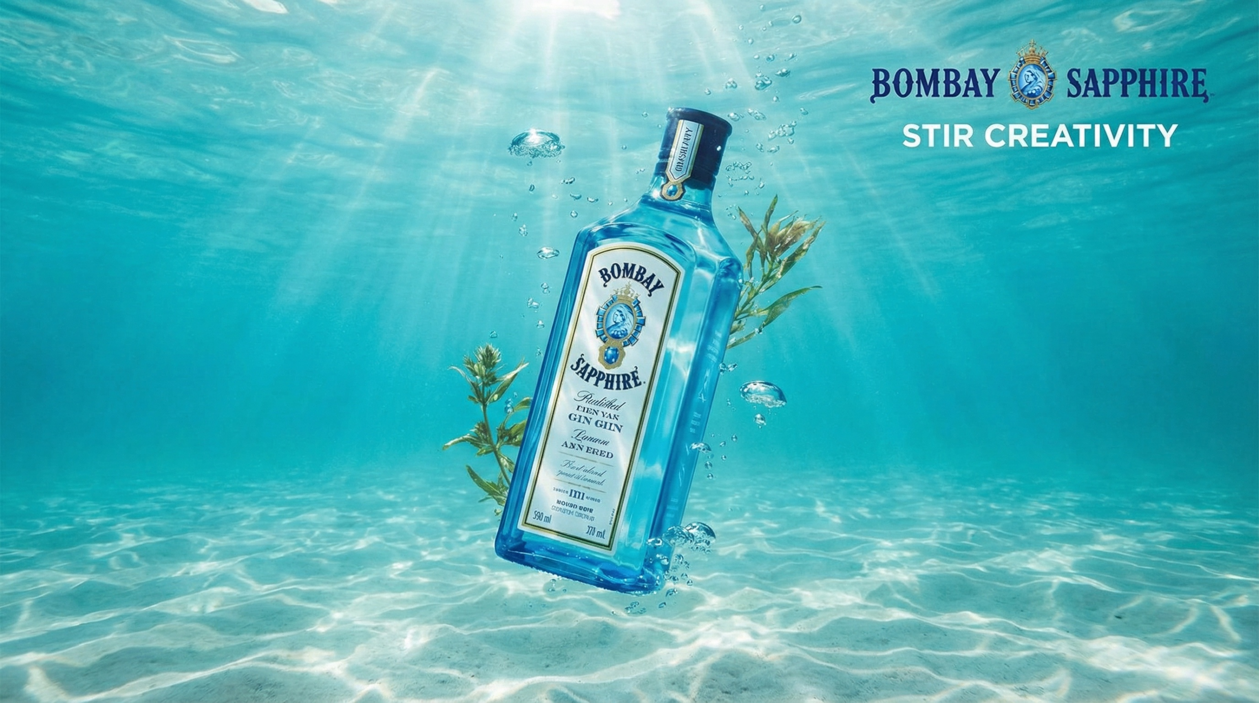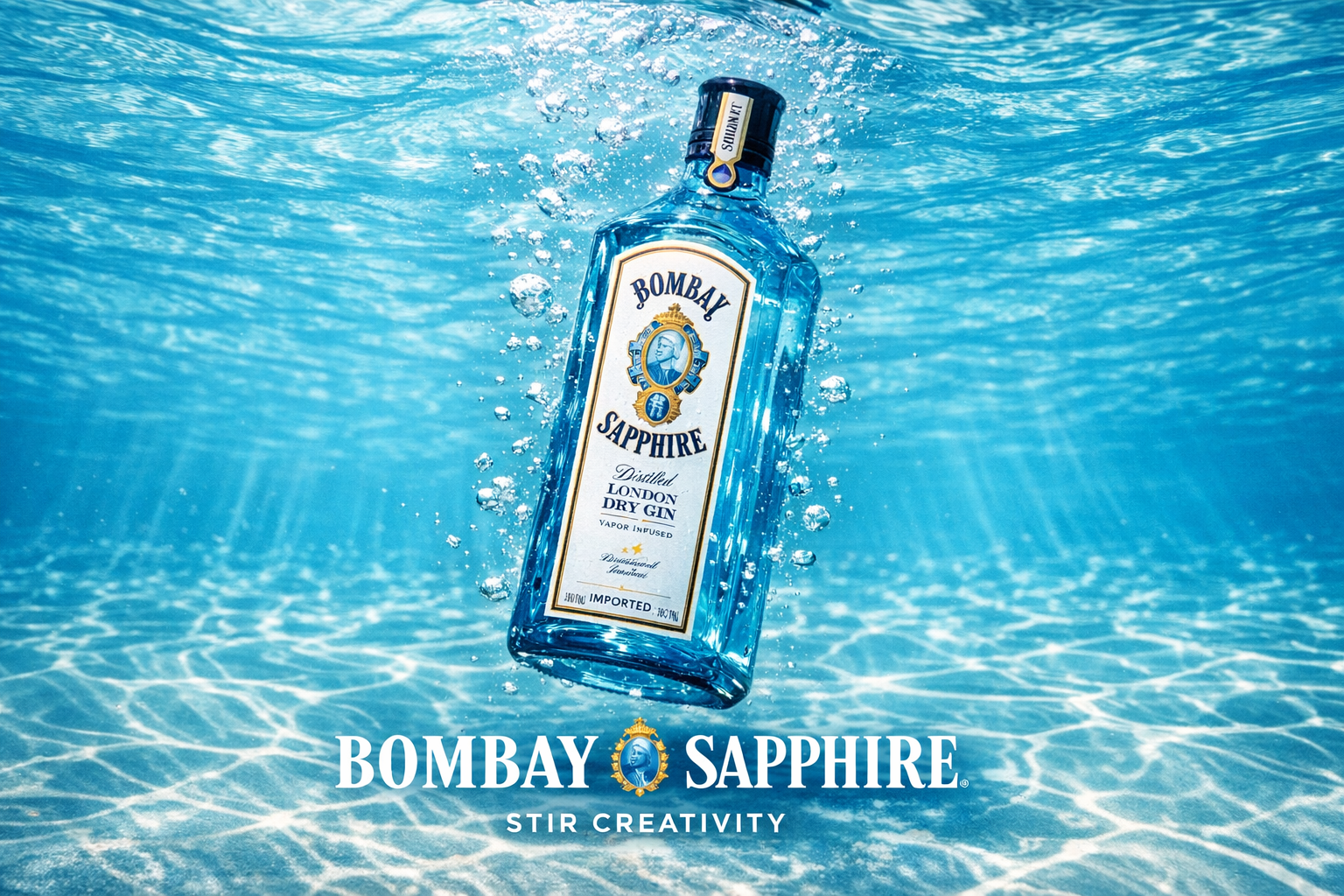 A bottle of Bombay Sapphire Gin submerged in crystal clear water, caustic light patterns dancing across surface, underwater photography, pristine clarity, suspended weightlessness, aquatic elegance, high-speed capture, refreshing aesthetic. Add the relevant brand logo and slogan for marketing use.