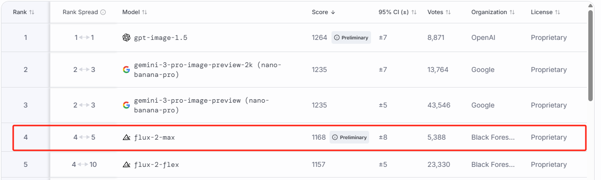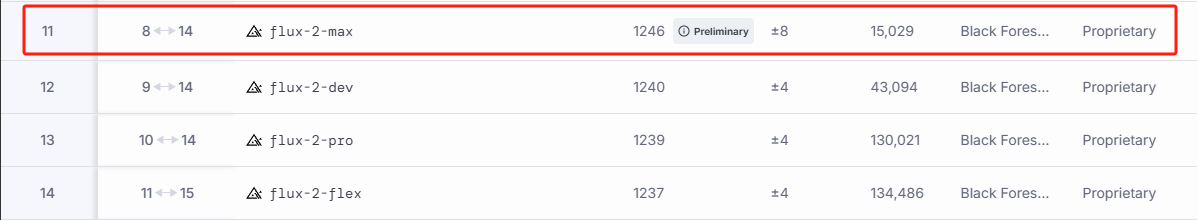 在最新的 LMArena 榜单上,Flux-2-Max 目前位居文生图第 4 名,图像编辑第 11 名