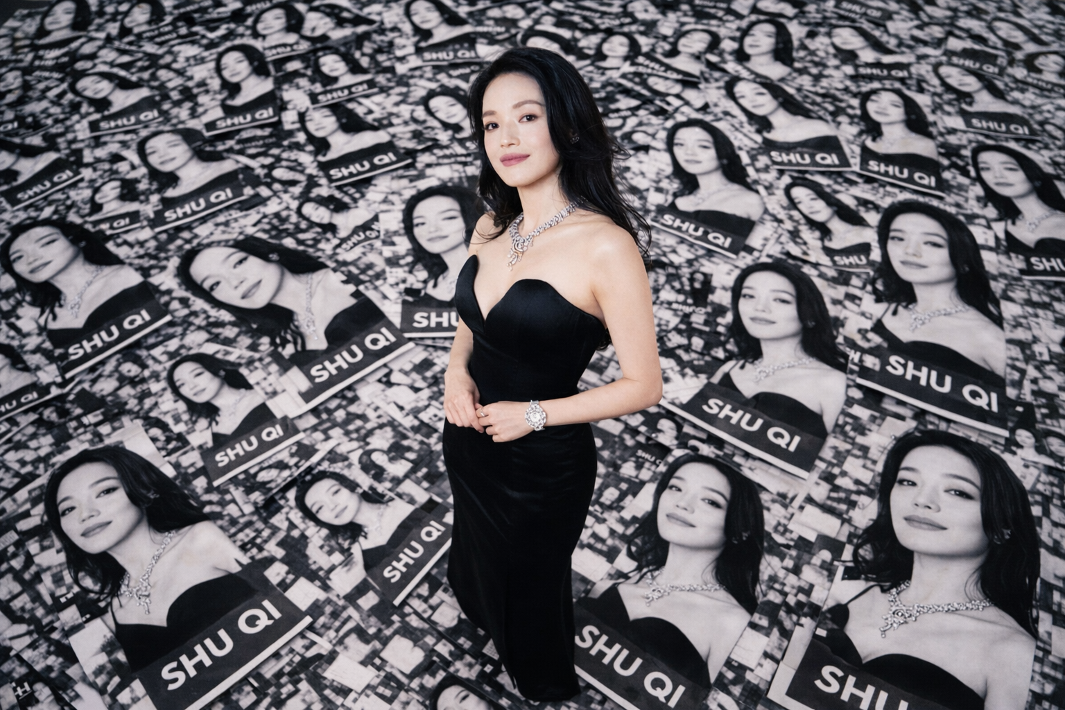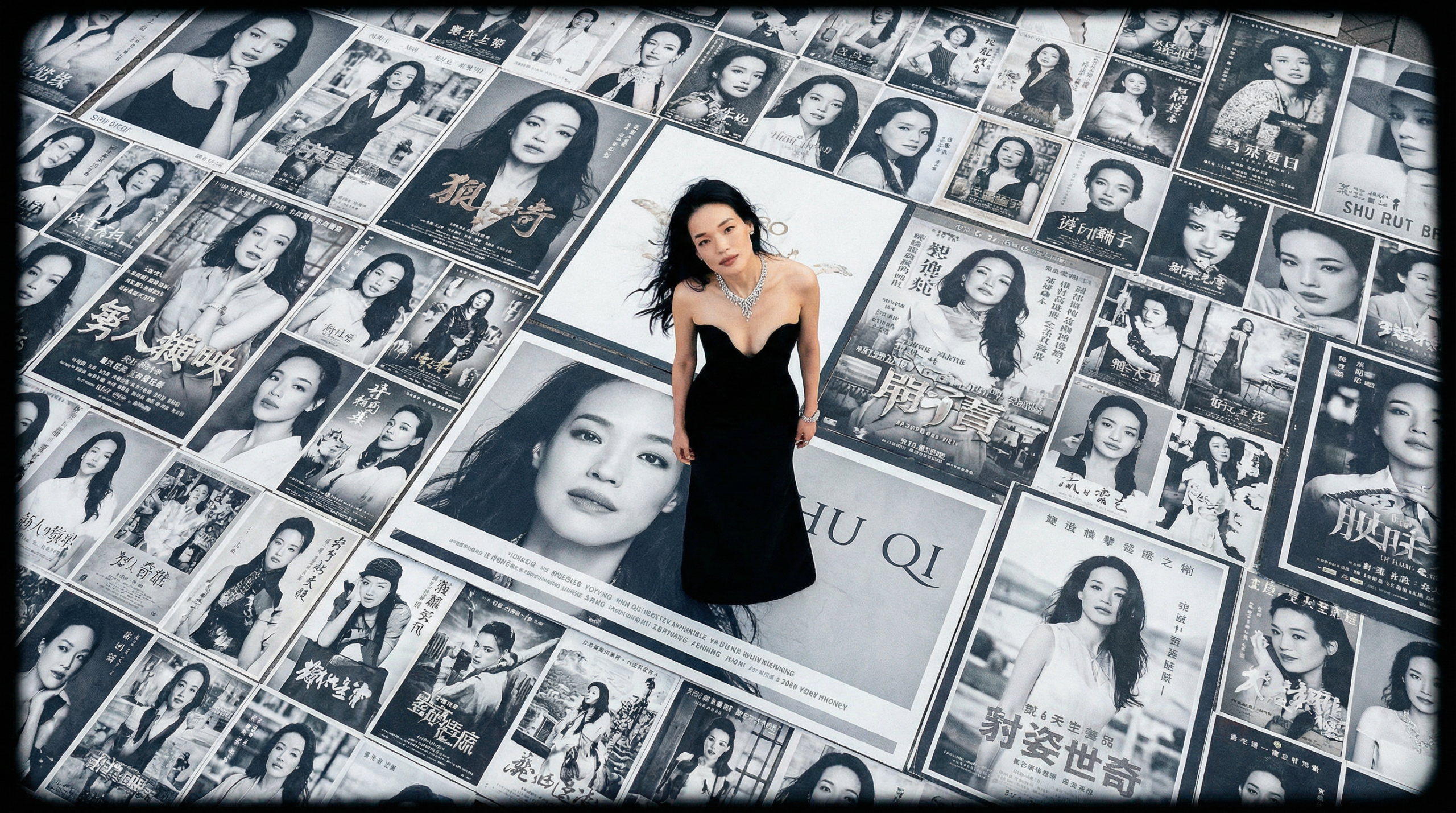This high-resolution bird’s-eye view photograph was taken with a LOMO Ic-a. The ground is covered with countless black and white billboard advertisements of the actress Shuqi, and standing on top of the advertisements is the characters from the reference picture.