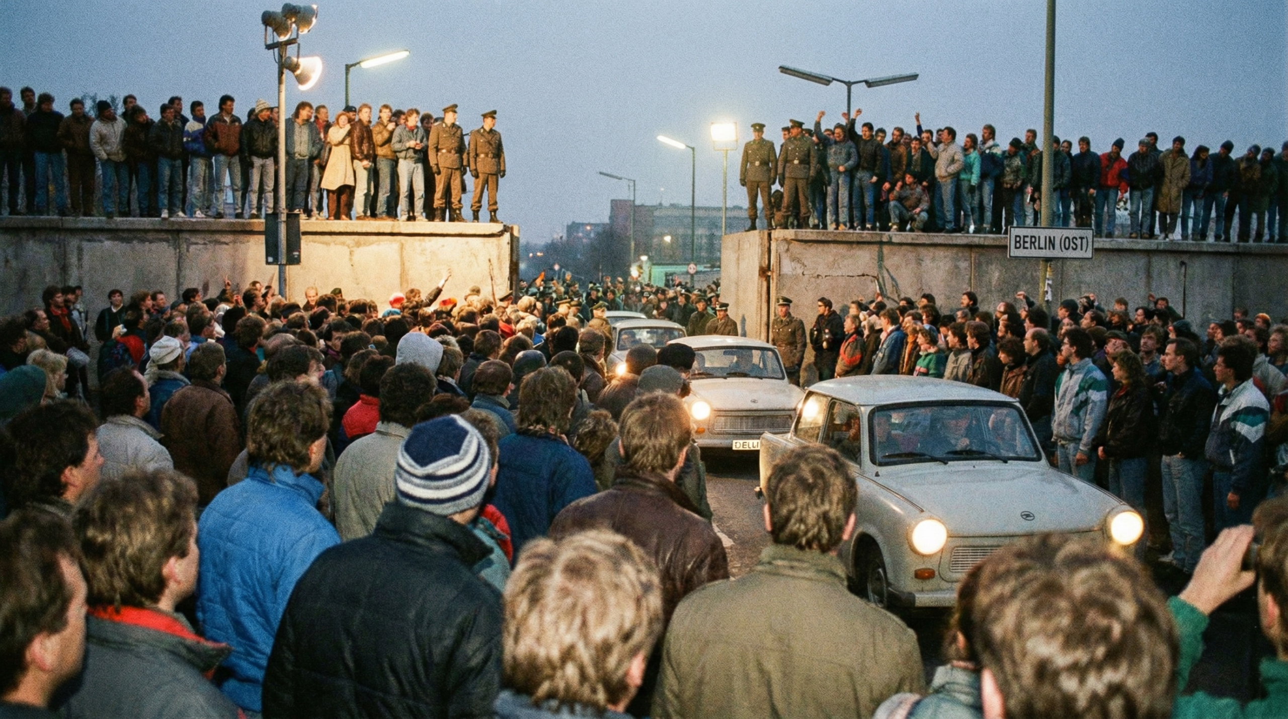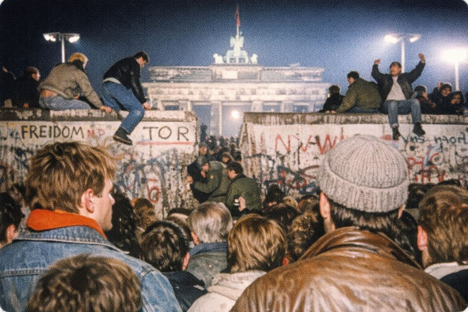 提示词:Realistic photo shot by Nikon FM2 taken at 52°31′N 13°23′E on Nov 9, 1989. Crowd perspective.