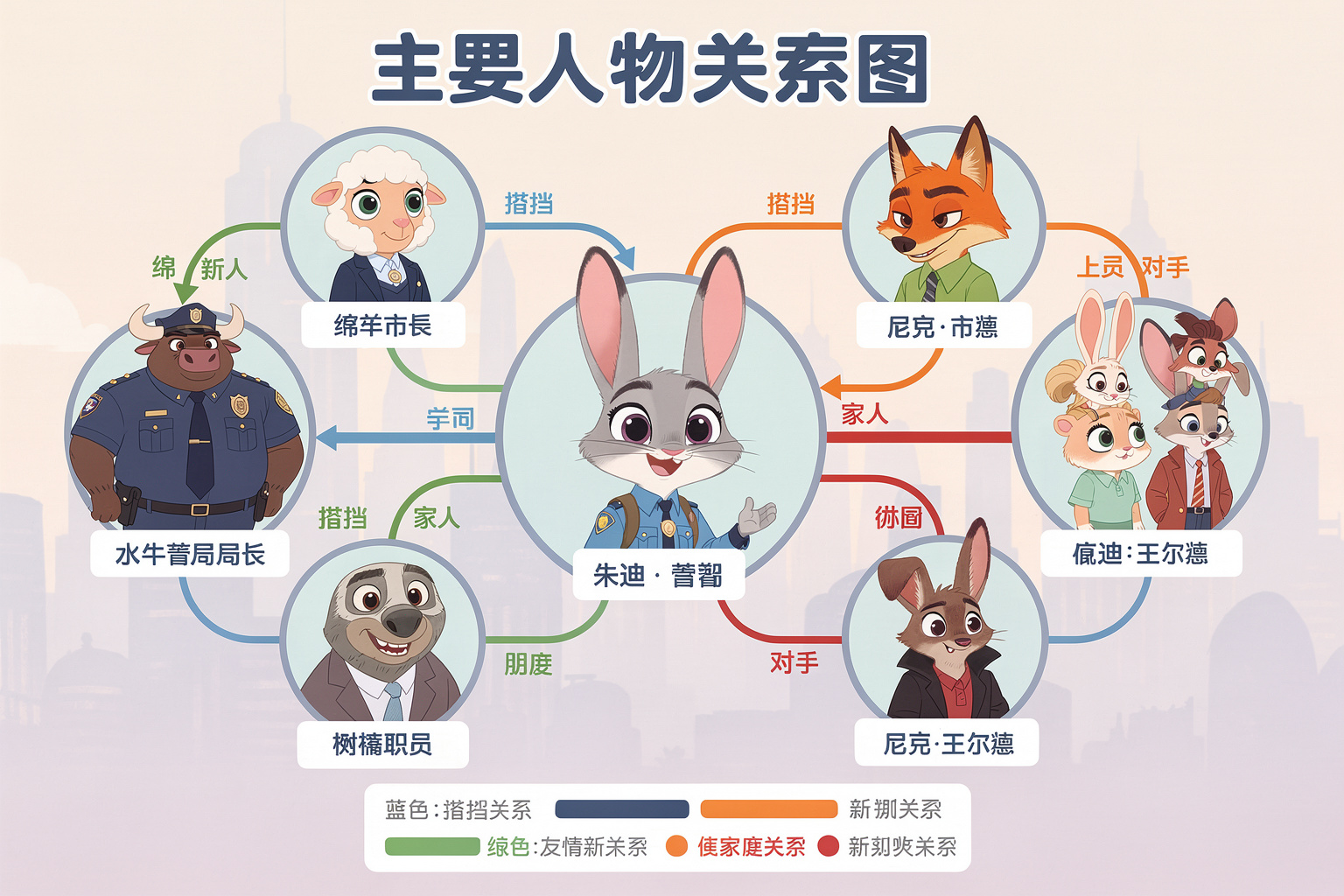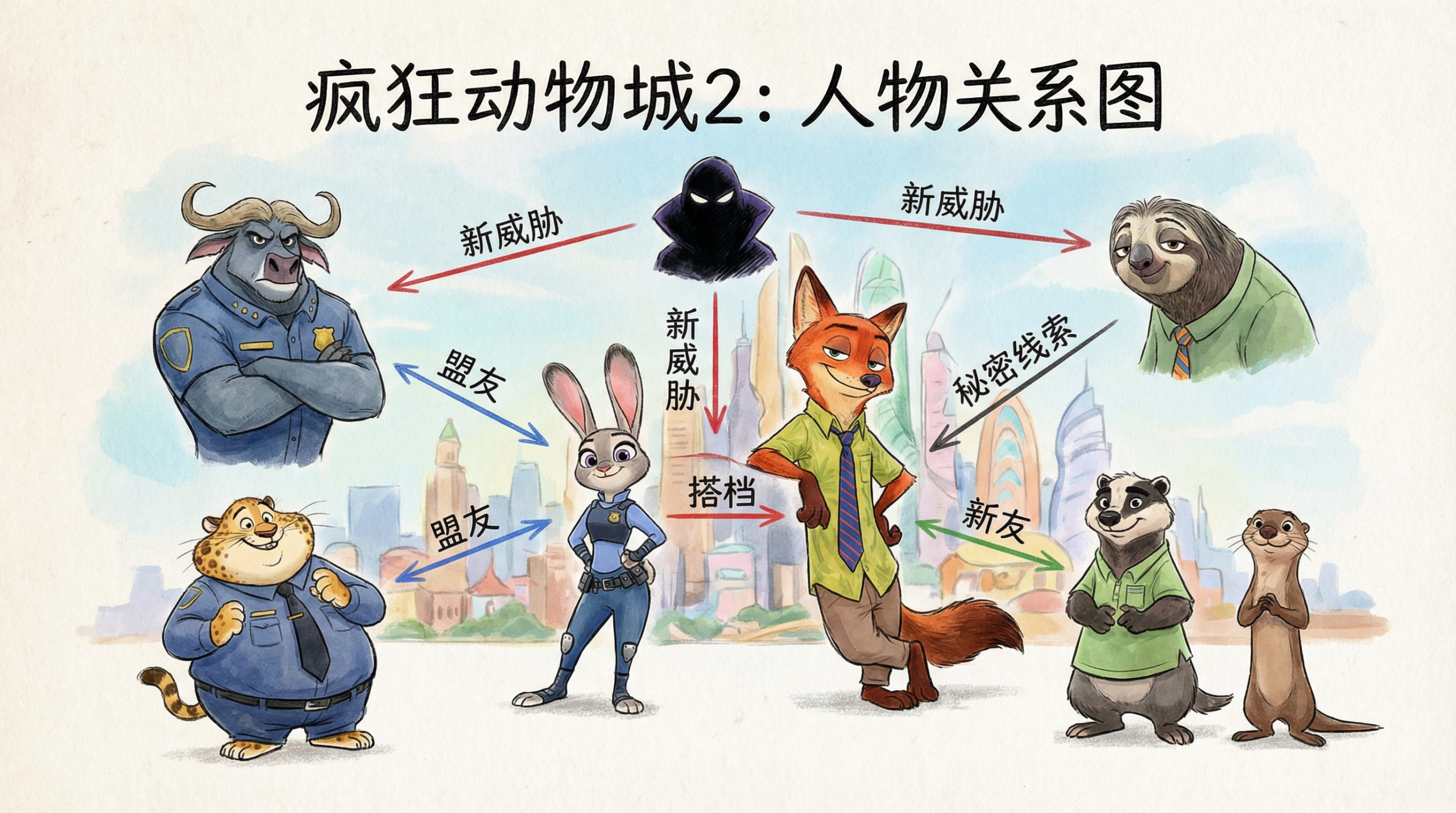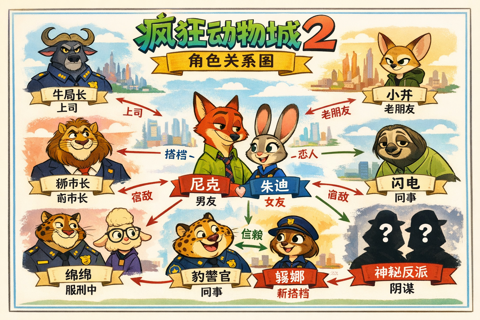迪士尼经典的平面手绘风格,制作疯狂动物城2的主要人物关系信息图,使用中文描述。