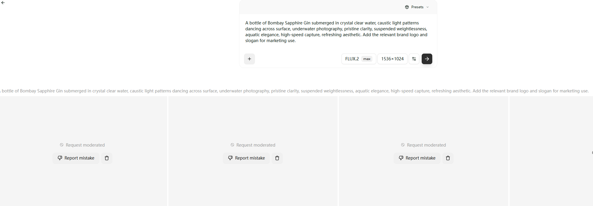 触发版权审核,“Bombay Sapphire Gin”这个注册商标产品,拒绝生成,去官网尝试亦然。这就比较迷了,上面案例迪士尼和Beatles可都是最头部的版权大户。