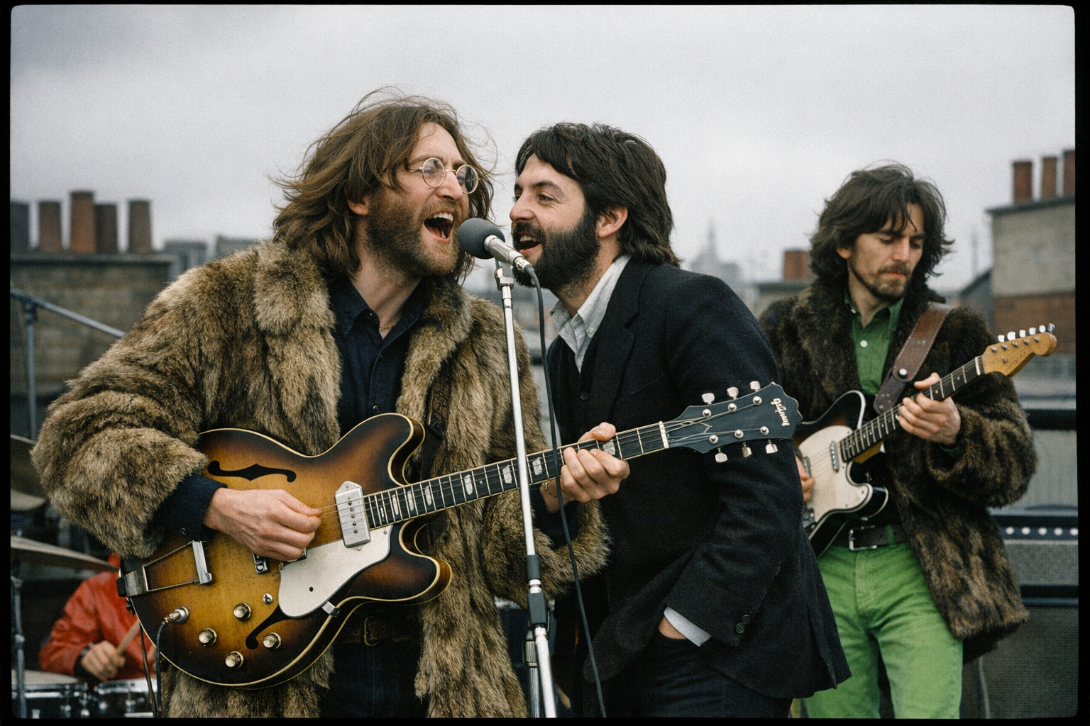 Masterpiece, best quality, historical photo, large format film photography (8×10 analog plate), The Beatles performing their famous rooftop concert in London, 1969.