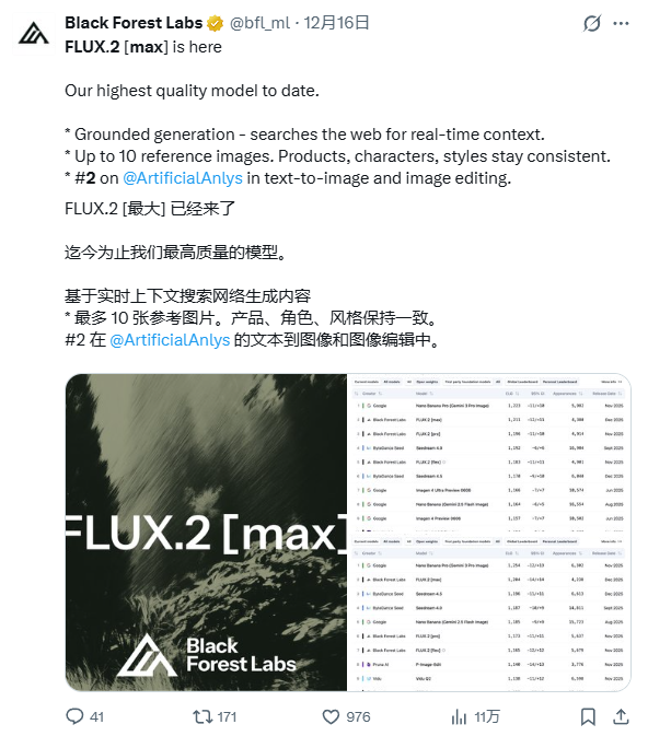 12月16日,Black Forest Labs 毫无预兆地抛出了一枚重磅炸弹——Flux.2 [max] 正式发布。这次发布堪称一次彻底的突袭,因为在早期的官方路线图中,Flex 版本曾被定为旗舰,而 [max] 的横空出世,直接打破了既有的产品天花板,重新定义了 Flux 系列的最高标准。